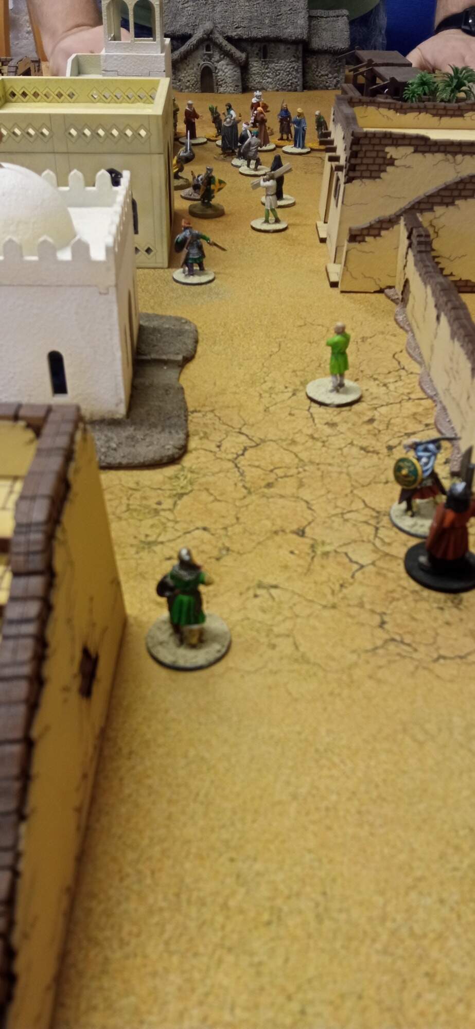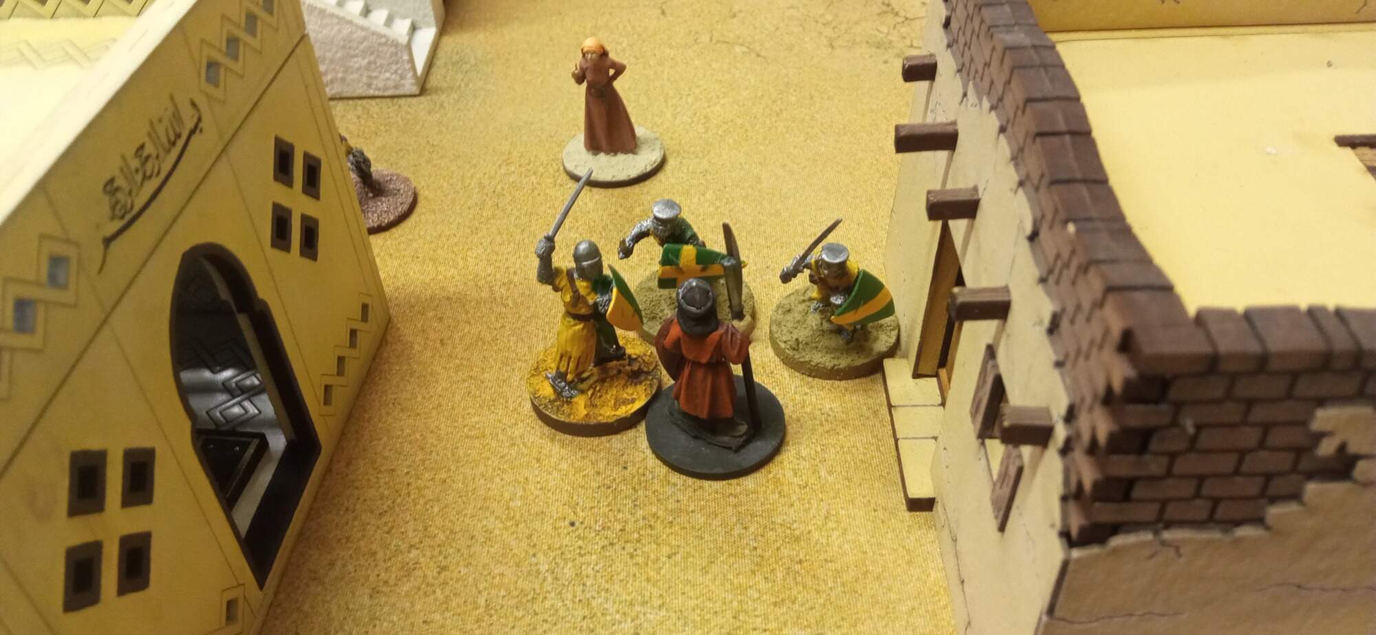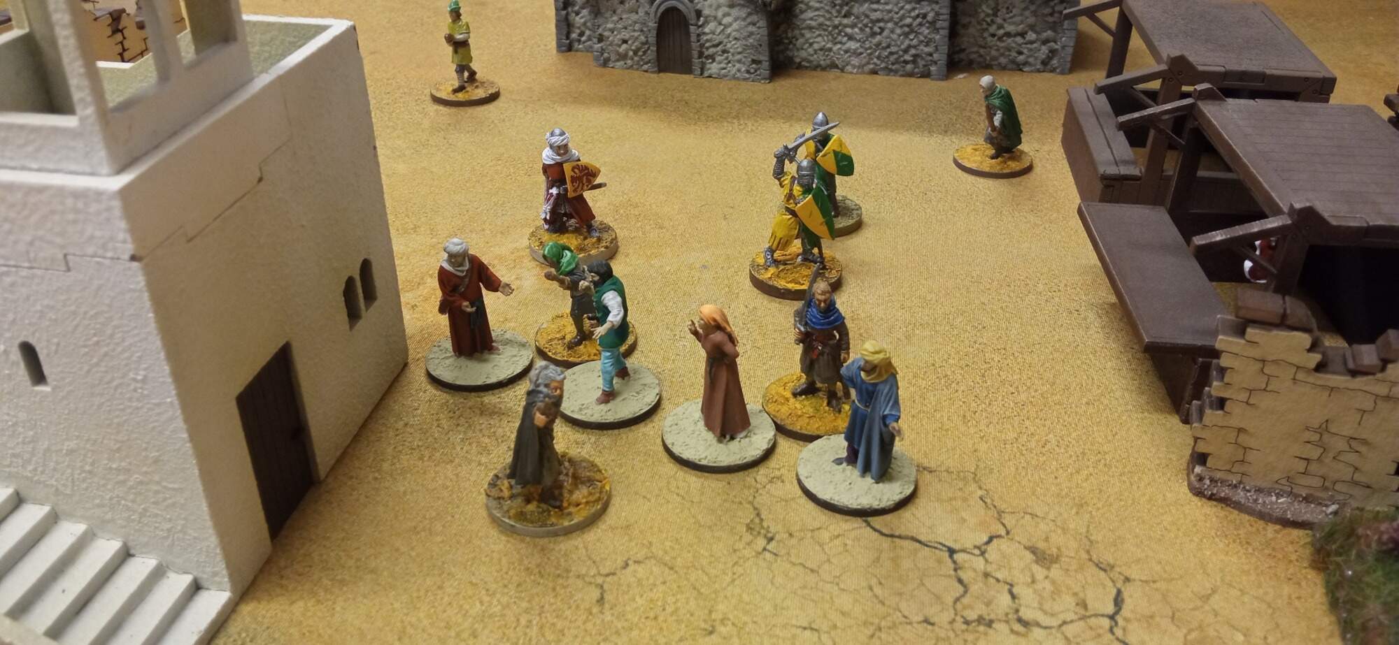 Umístění překážek: Adelard je v kostele tak aby byl v nástupní zóně obránce, Civilisty, podrážděného mezka a drůběž umísťuje obránce při umisťování terénu. Drůběž a mezka kamkoliv na úroveň terénu, vždy dva civilisty na každou čtvrtinu stolu, přičemž jeden z nich může být na střeše.
